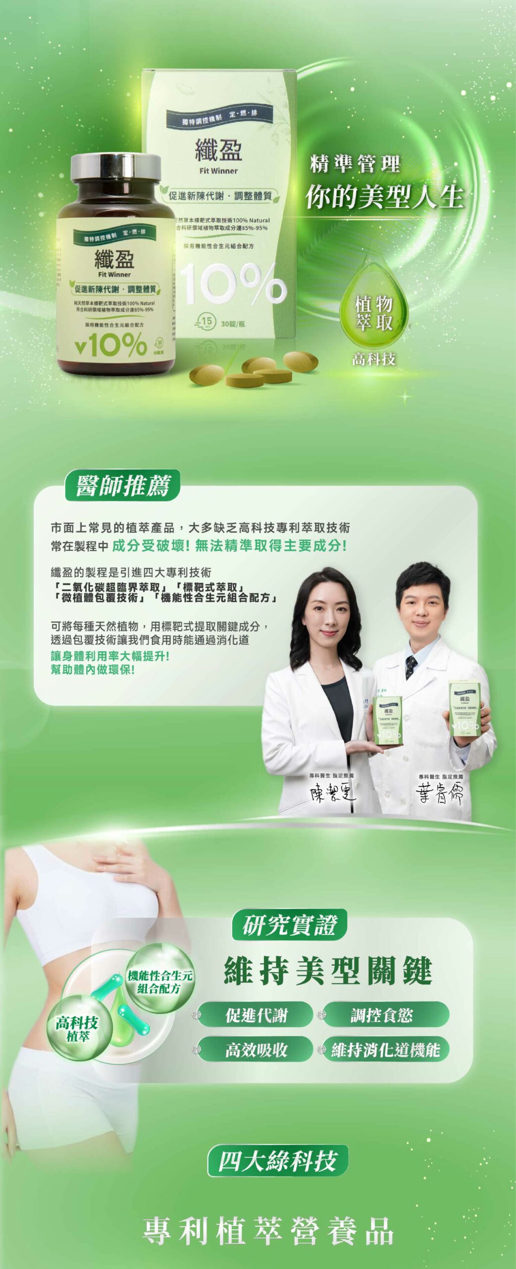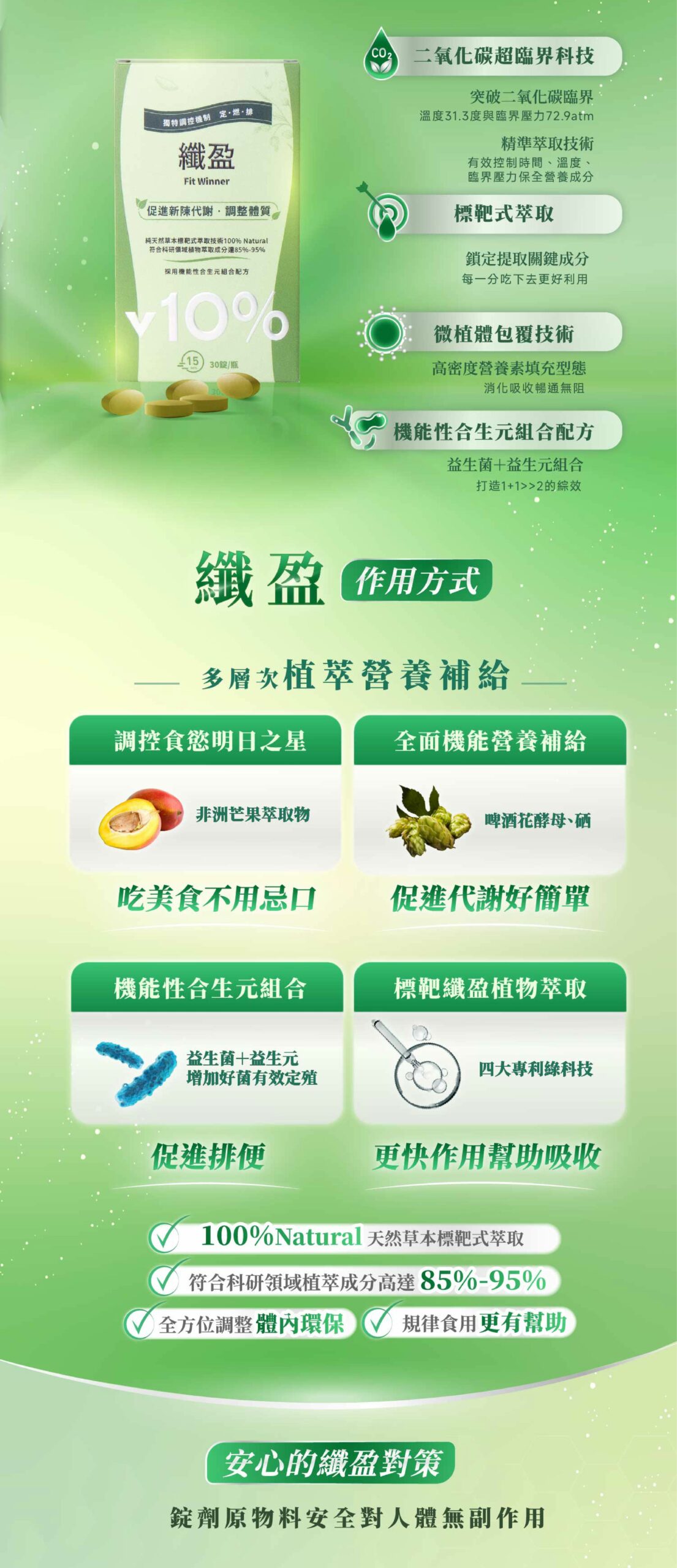 「纖盈對策」定位為日常型輕保健瘦身產品,主打天然植物複方搭配營養補充,訴求『不靠刺激排便、不靠極端節食』的健康瘦身法。