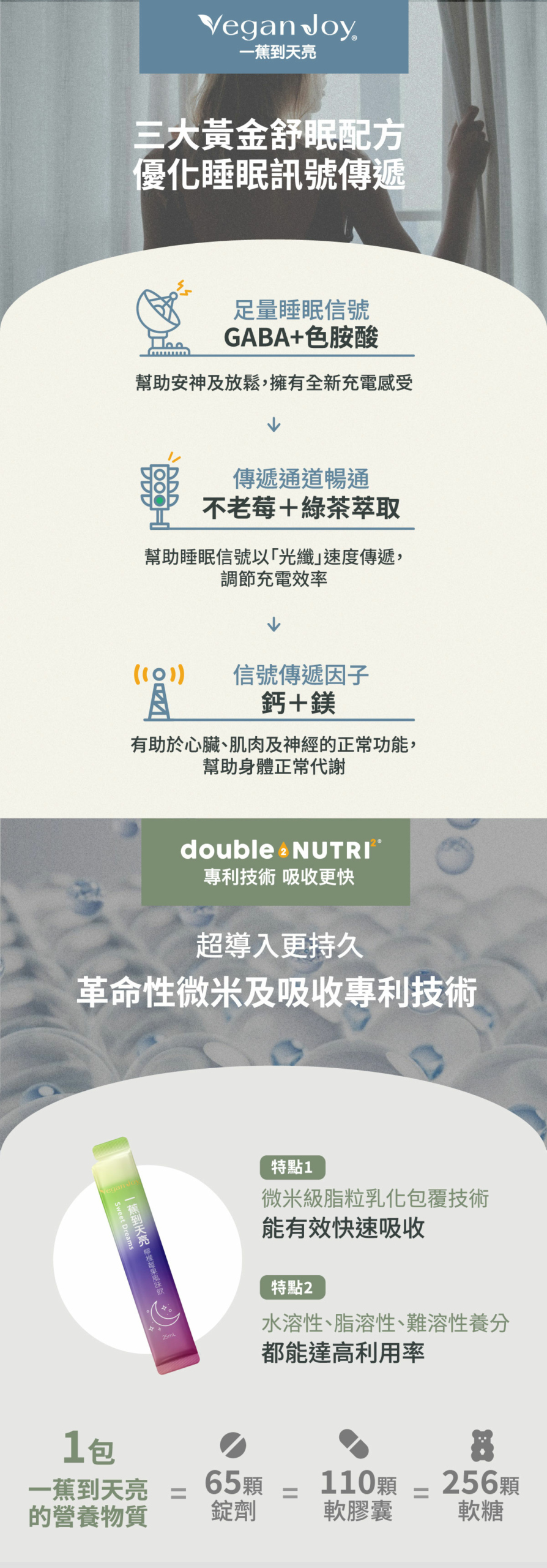 - 以醫學分析失眠者的現狀與成因,喚起共鳴再帶入產品有效成份,使用者能夠清楚了解產品特色,文字使用能符合法規標準,並能將研究數字與國際論文等市場專利特色精準呈現,給人用心做好產品的實在感受。